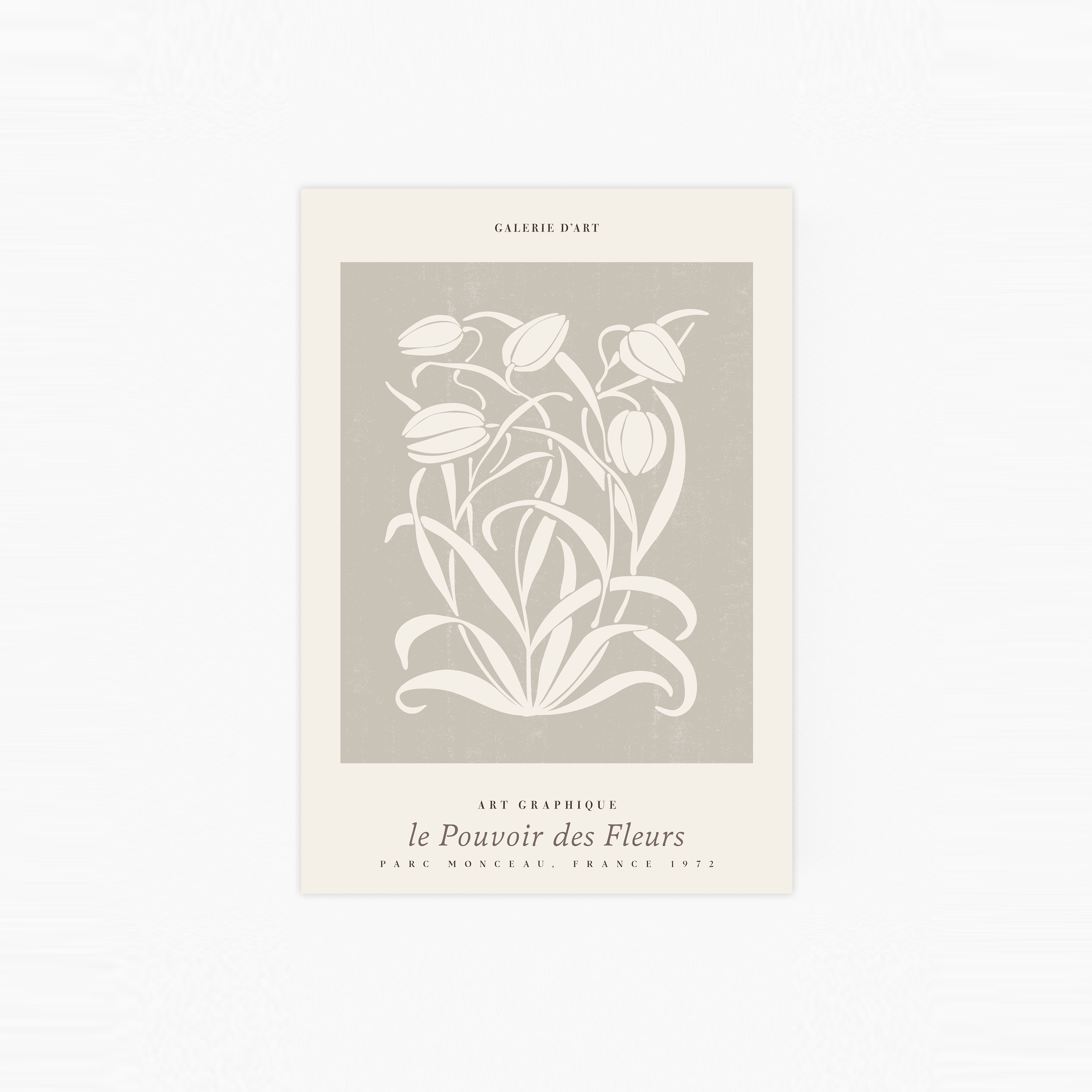Une élégante illustration présente une collection de feuilles blanches à l'intérieur d'un carré gris sur un fond doux. Au-dessus et en dessous de l'illustration se trouve du texte. Les couleurs monochromes simples apportent une touche de style à votre maison, et cette œuvre d'art s'harmonise parfaitement avec des photographies classiques en noir et blanc dans un mur de galerie.