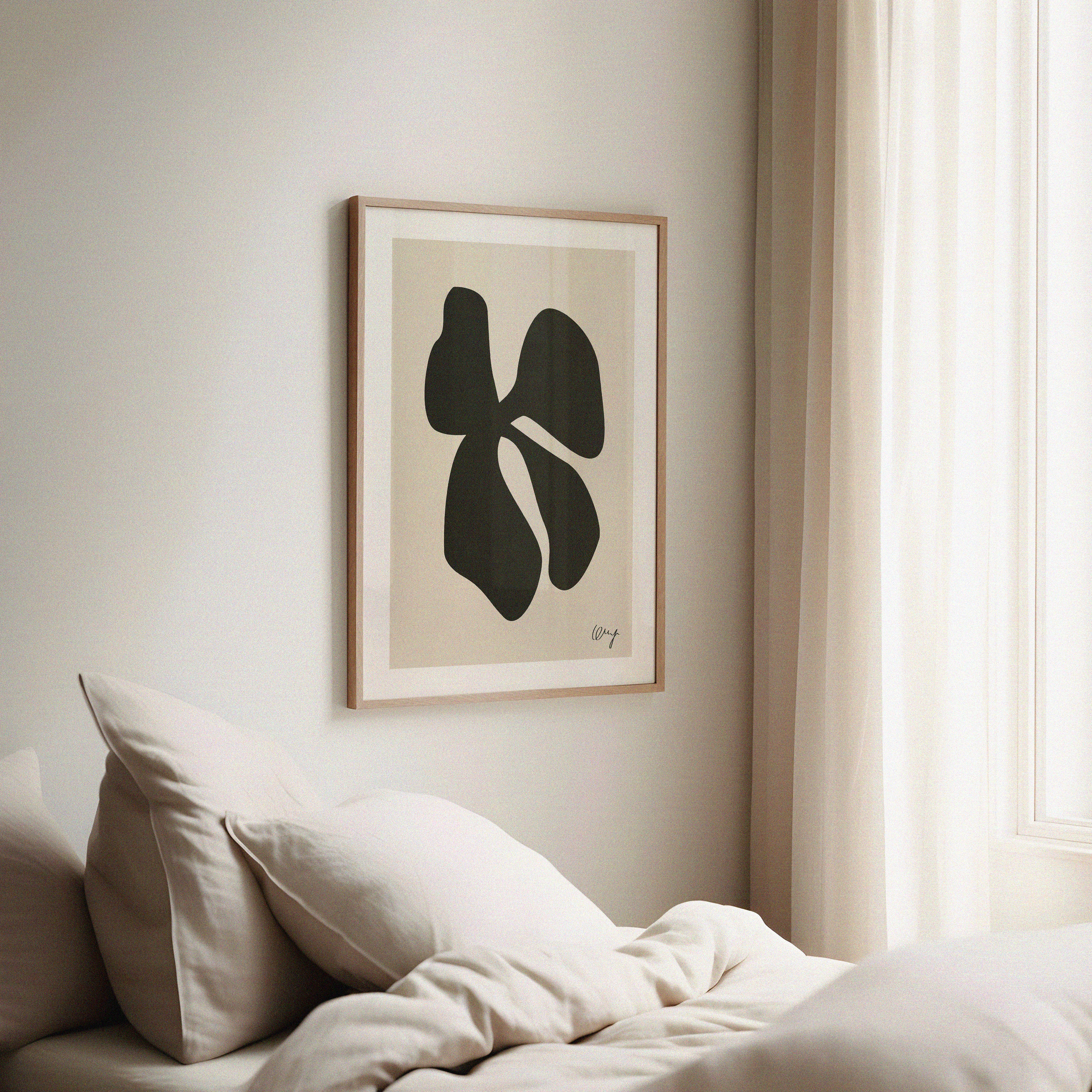 Affiche minimaliste avec un design abstrait noir sur un fond beige. Parfaite pour une décoration murale moderne et élégante.