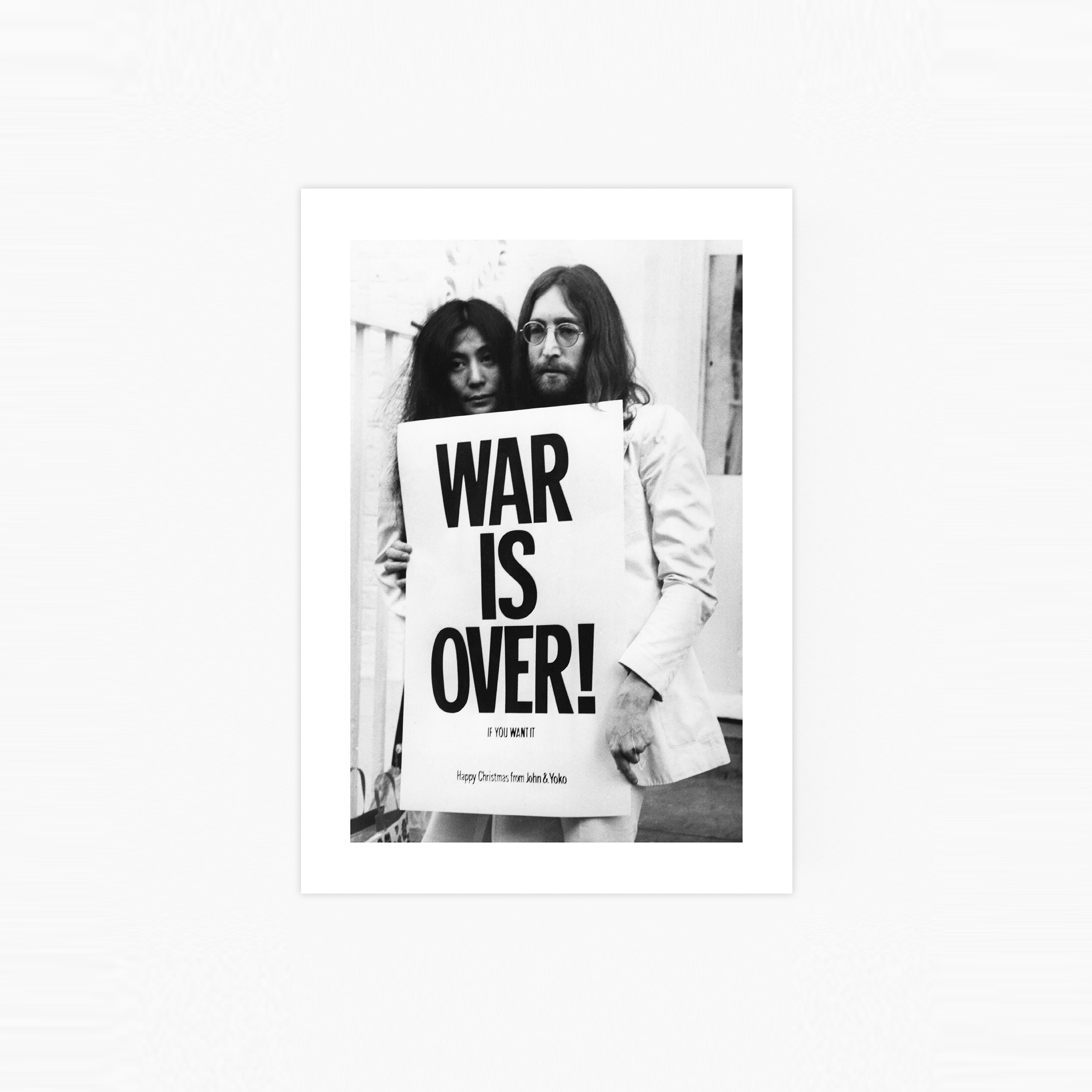 Une photo emblématique du couple légendaire John Lennon et Yoko Ono tenant une pancarte avec l'inscription "WAR IS OVER". John Lennon, célèbre pour son travail avec les Beatles, et Yoko Ono, connue pour son art performatif, sont devenus des symboles du mouvement pour la paix à la fin des années 60 et dans les années 70. L'affiche "War Is Over" est dotée d'un passe-partout blanc intégré qui encadre élégamment l'image.